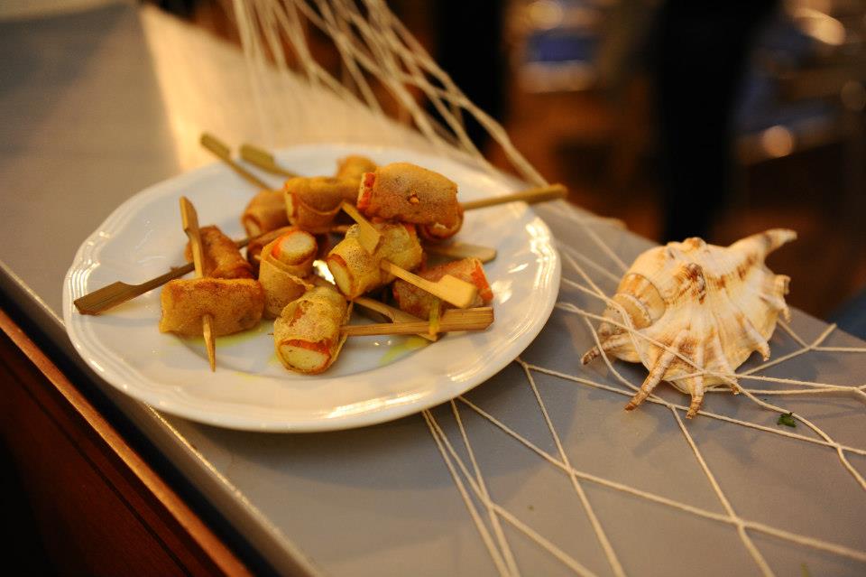 Puis, coupez en 2 le surimi enroulé ainsi obtenu, et piquez dans chaque moitié un pic à brochette. Recommencez jusqu'à épuisement des bandes de bricks.